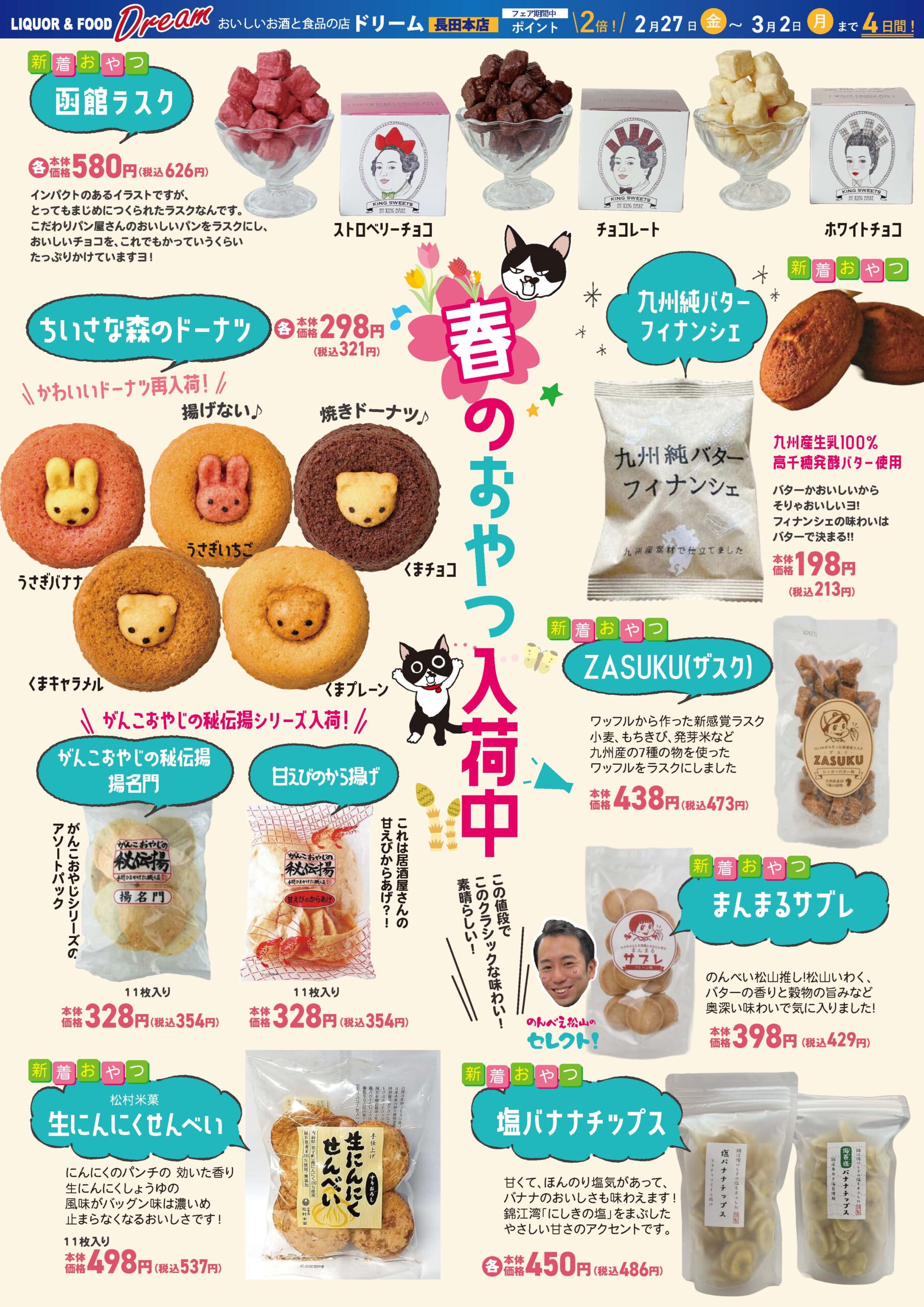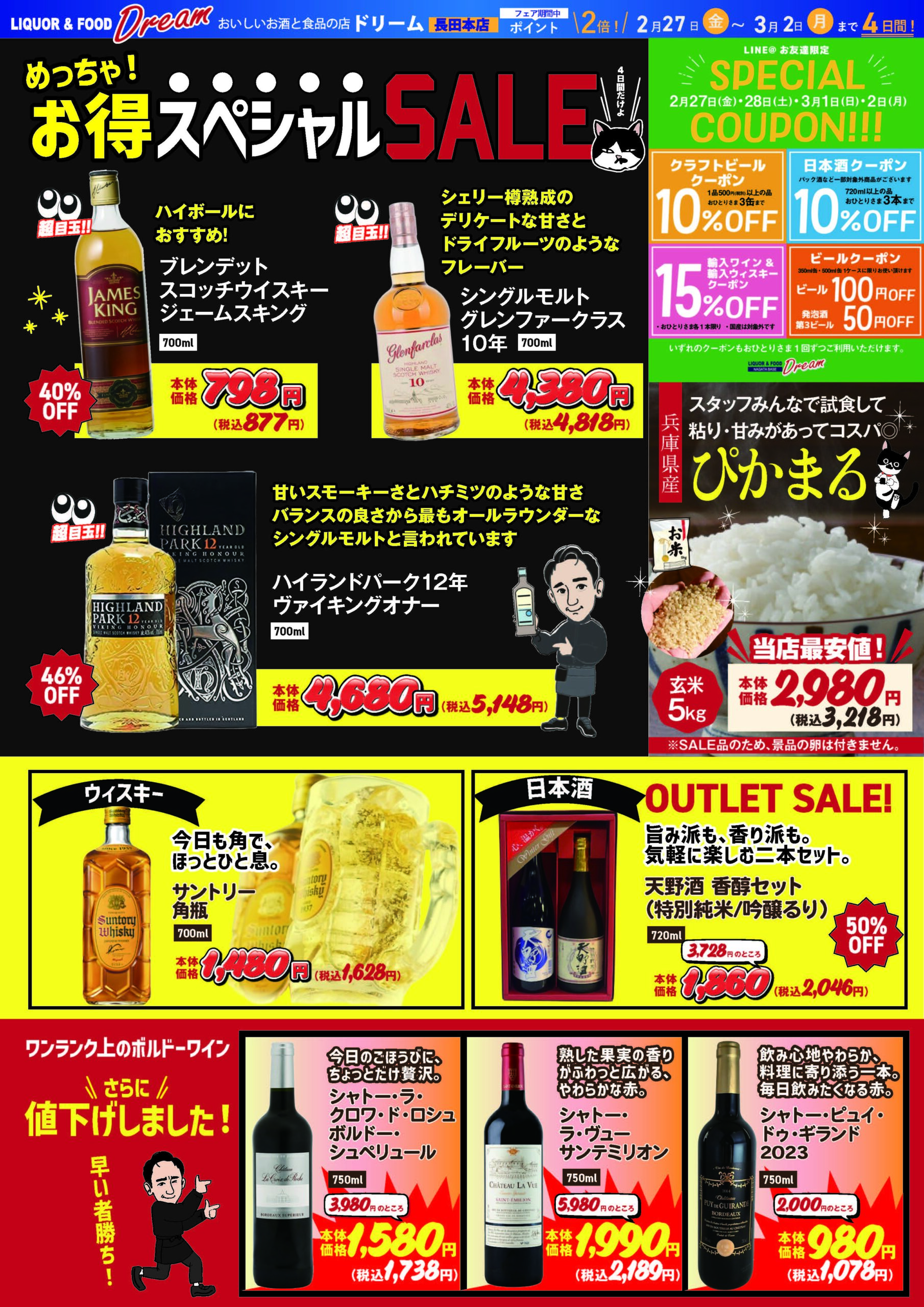 少しずつ春の足音が近づいてきましたね!今週末から週明けにかけて、ドリームでは皆様の食卓とリラックスタイムを全力で応援する「めっちゃお得なスペシャルセール」を大開催いたします!大人気のウイスキーや上質なボルドーワインの驚きの値下げから、ティータイムを彩る春の新作おやつまで、見逃せないお買い得商品が店内いっぱいに並びます。この4日間は、ぜひドリームへお急ぎください! PDFで見る 愛を込めて、極上の一杯を。ドリーム 2026 バレンタイン・プレミアムセール開催! 前の記事 【3月13日〜3月16日限定】ドリームがお届けする「激アツ!国産ウイスキー大放出セール」開催! 次の記事